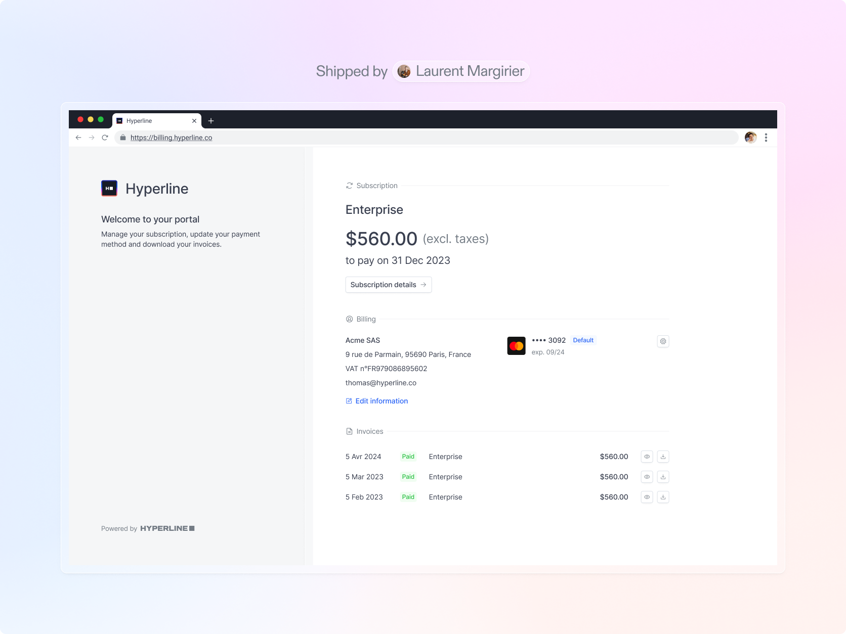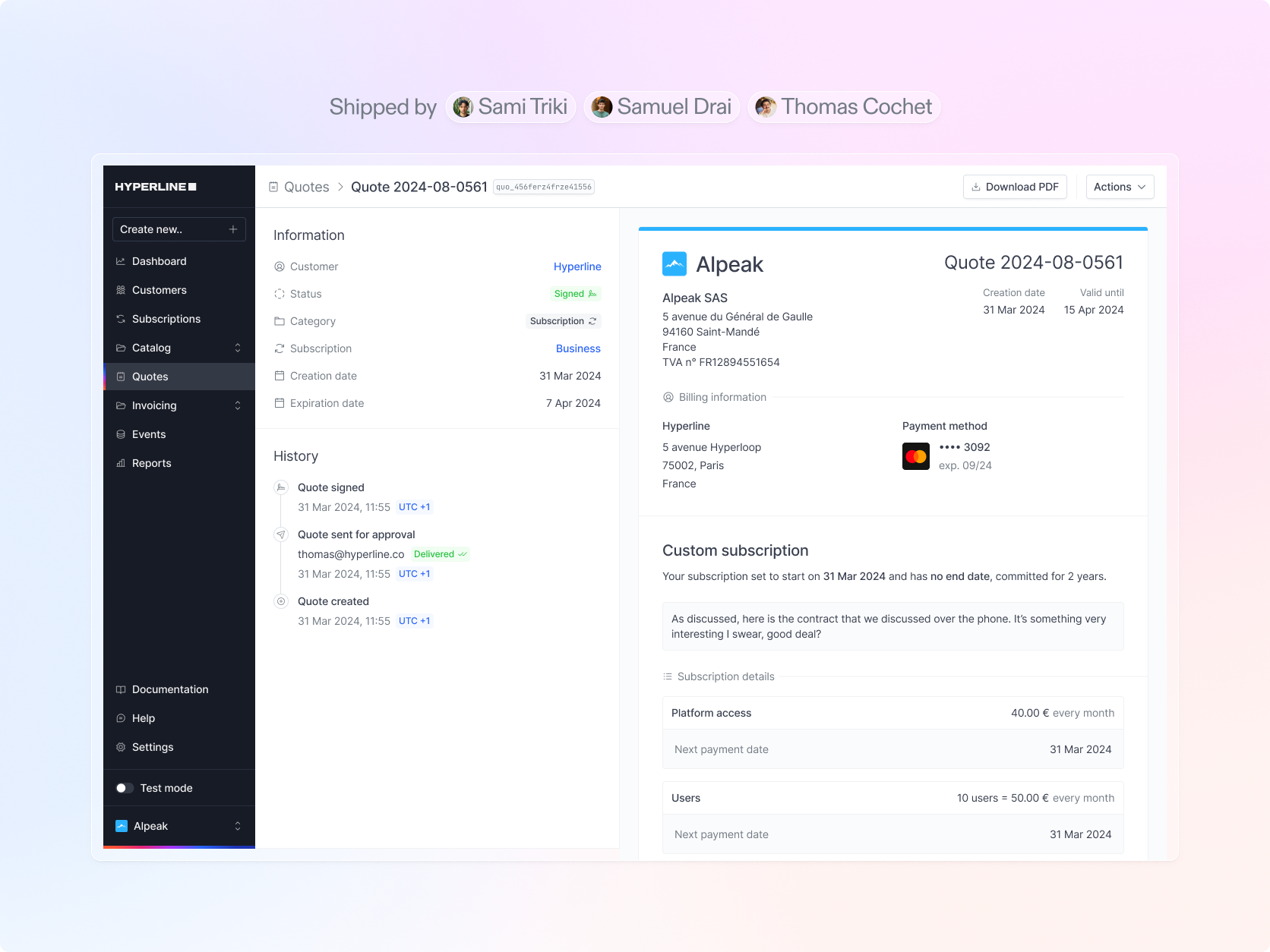 In our mission to simplify all topics related to billing, we are introducing a new quoting feature native in Hyperline. Create a quote containing subscription configuration and details, and send it for signature to your customer. The subscription and invoicing will start automatically with all the agreed price and contract configurations, eliminating the need for additional manual actions in between.