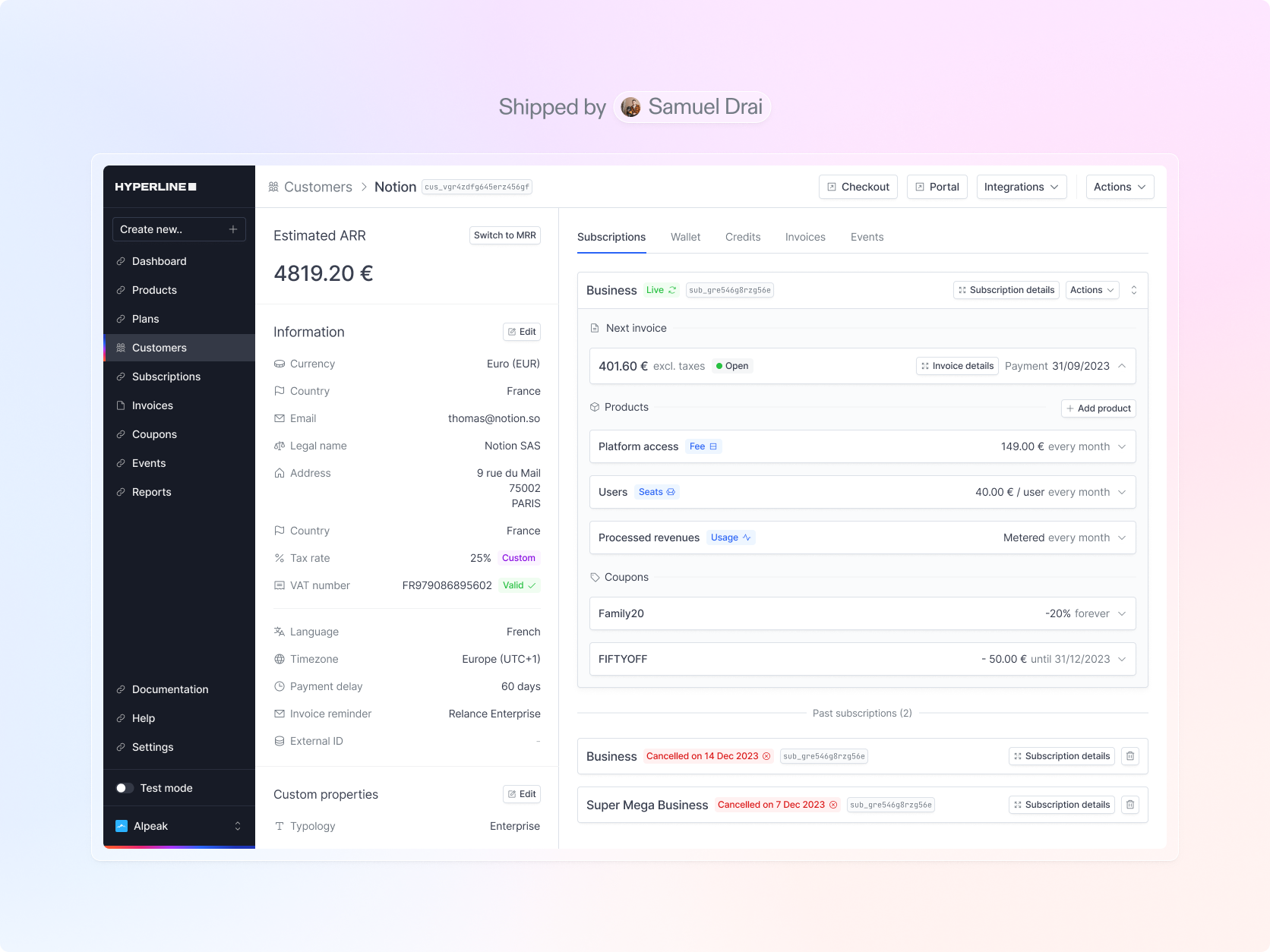 We now list all past and canceled subscriptions on each customer, providing you with detailed visibility into their history. Track subscription changes, upsell, downsell, and customer evolution in a single place.