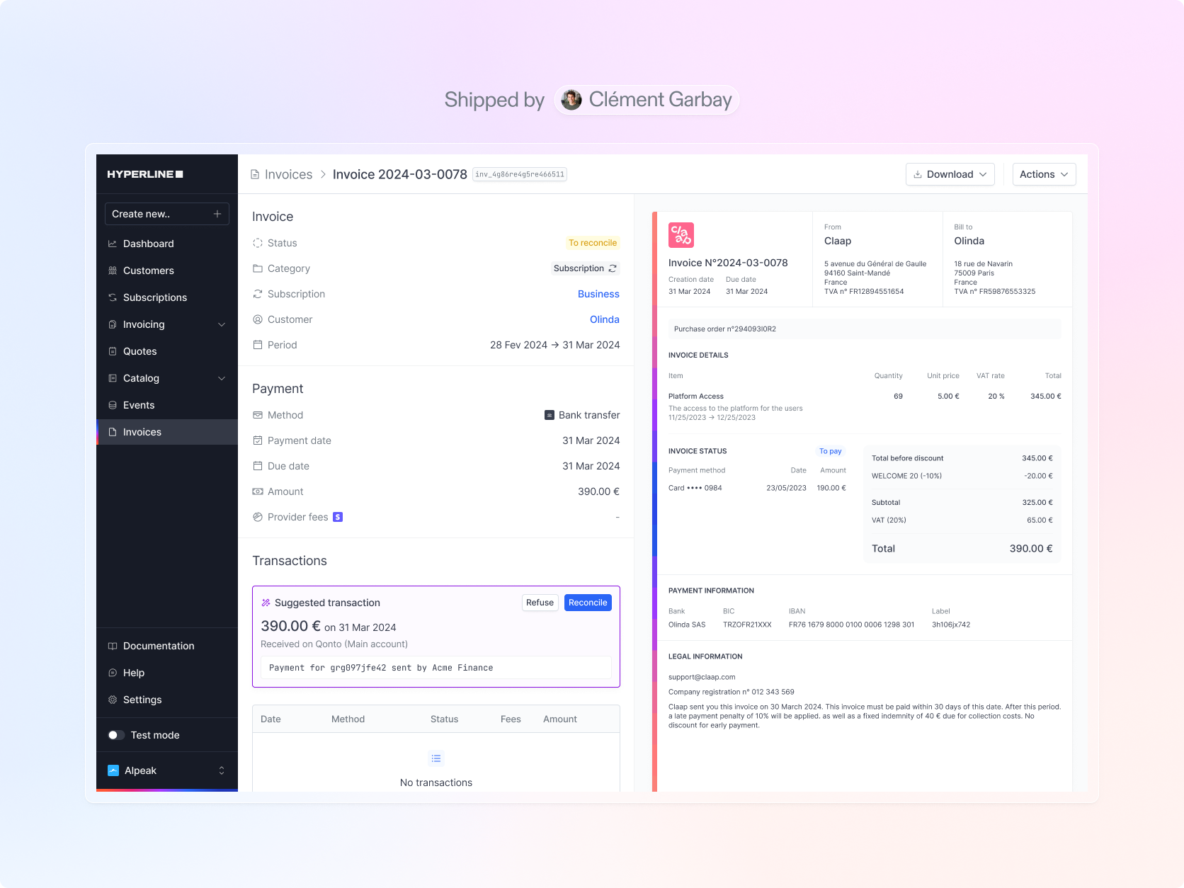 Last month, we announced a new method to streamline the invoice reconciliation process by incorporating generated and unique bank details attached to the invoices, leveraging capabilities from Mollie. Taking this initiative forward, we are now enabling you to connect any external bank account and automatically reconcile transactions received on it with Hyperline invoices!