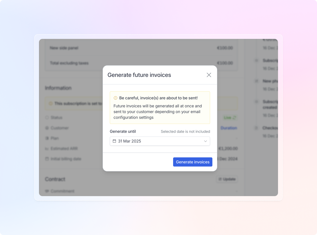 We’ve added a feature to generate subscription invoices in advance. This is particularly useful when you want to prepare, issue, and send an invoice to your customer before the subscription officially starts or before the renewal date.