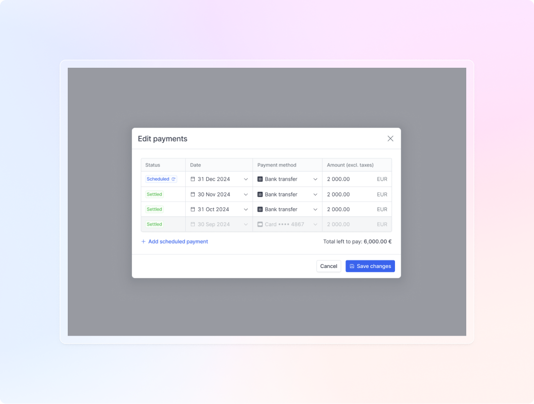 When creating an invoice, or for an invoice ready to be paid, you can now enable customers to pay in installments. Simply schedule transactions for specific amounts, dates, and payment methods (you can even mix payment methods). The payment schedule will then appear on the invoice for your customer, and transactions with automated payment methods (e.g., card or direct debit) will be initiated automatically on the configured dates.