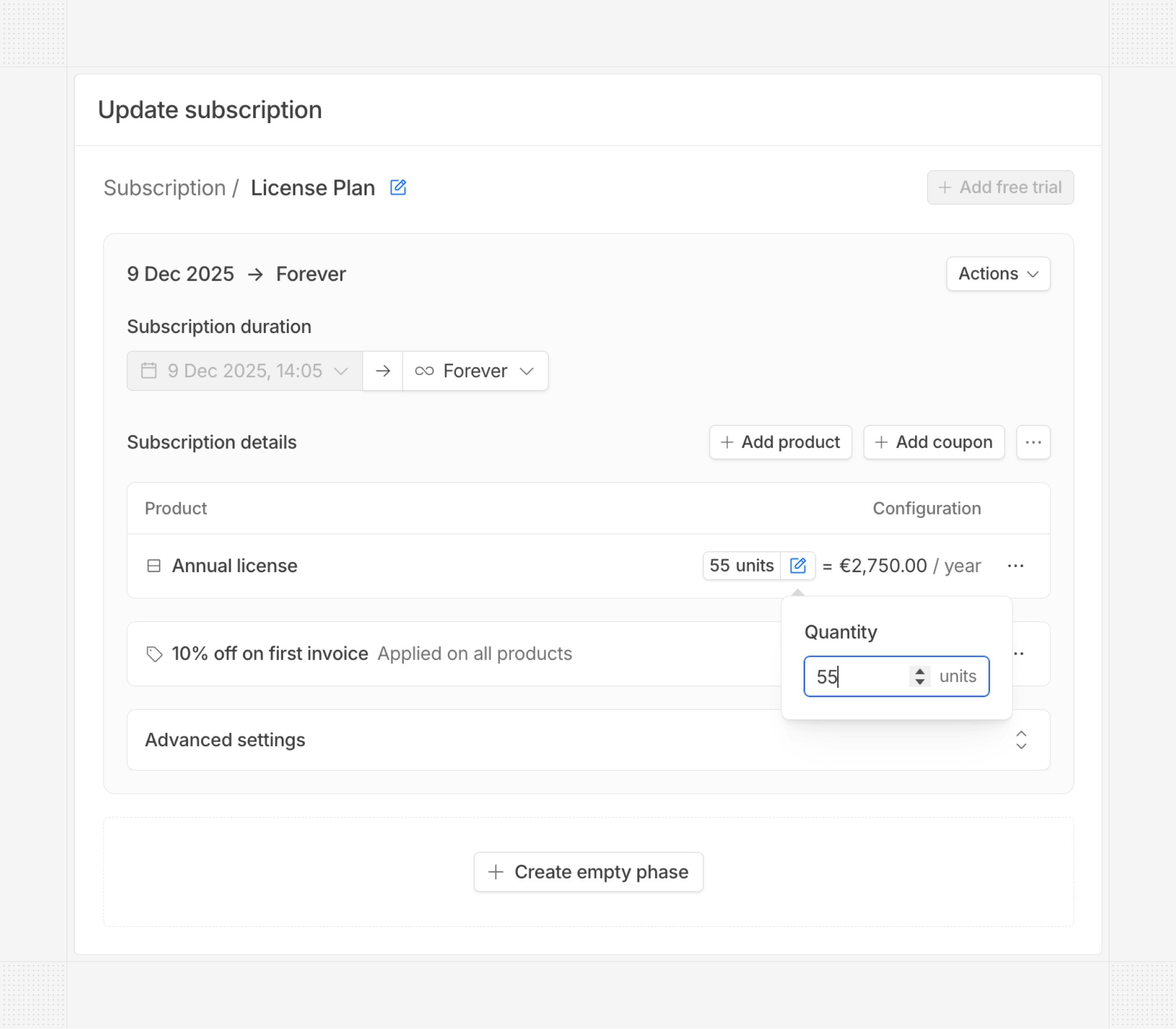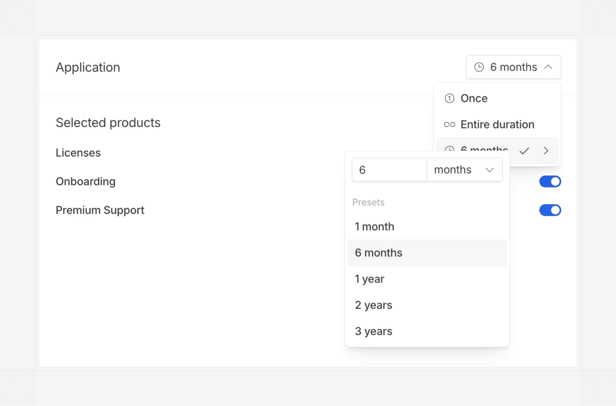 We made several improvements to the coupons feature. Coupons can now be applied with a relative duration (e.g., for 3 months), and you can choose which line items the coupon applies to when creating or editing an invoice in the visual editor.