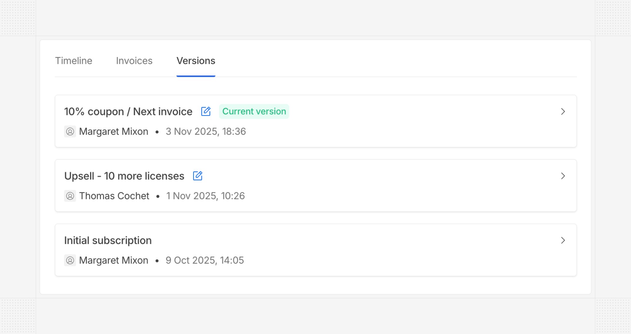 We introduced subscription versions to help you track changes to your subscriptions over time. Each time a subscription is updated, a new version is created, allowing you to view the full history of changes made to that subscription.
