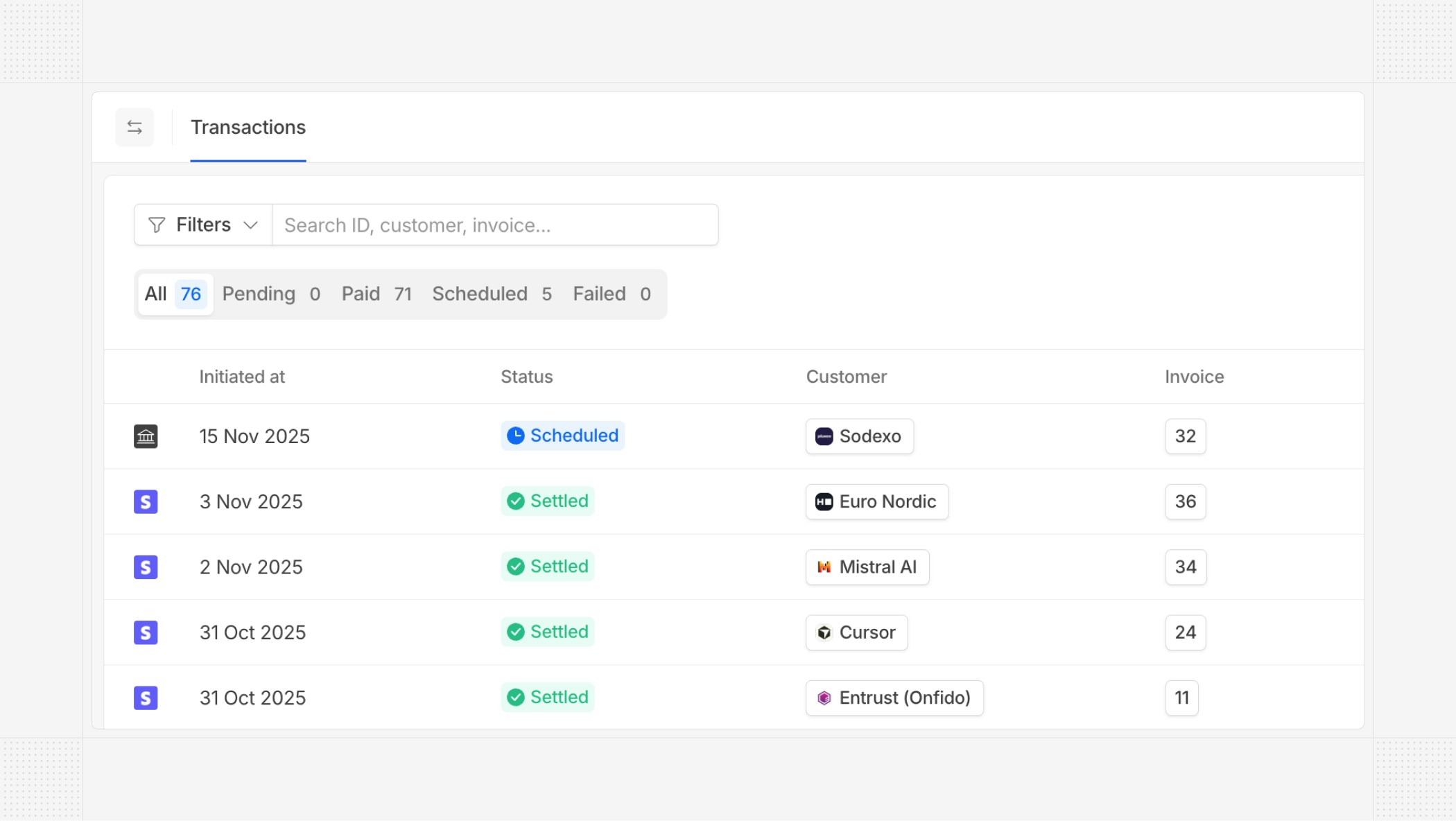 We added a brand-new page in Hyperline to track transactions at the account level. This page lists all transactions that occurred in your account, including payments and refunds, providing a clear overview of your cash activity. Filters and export options are also available.