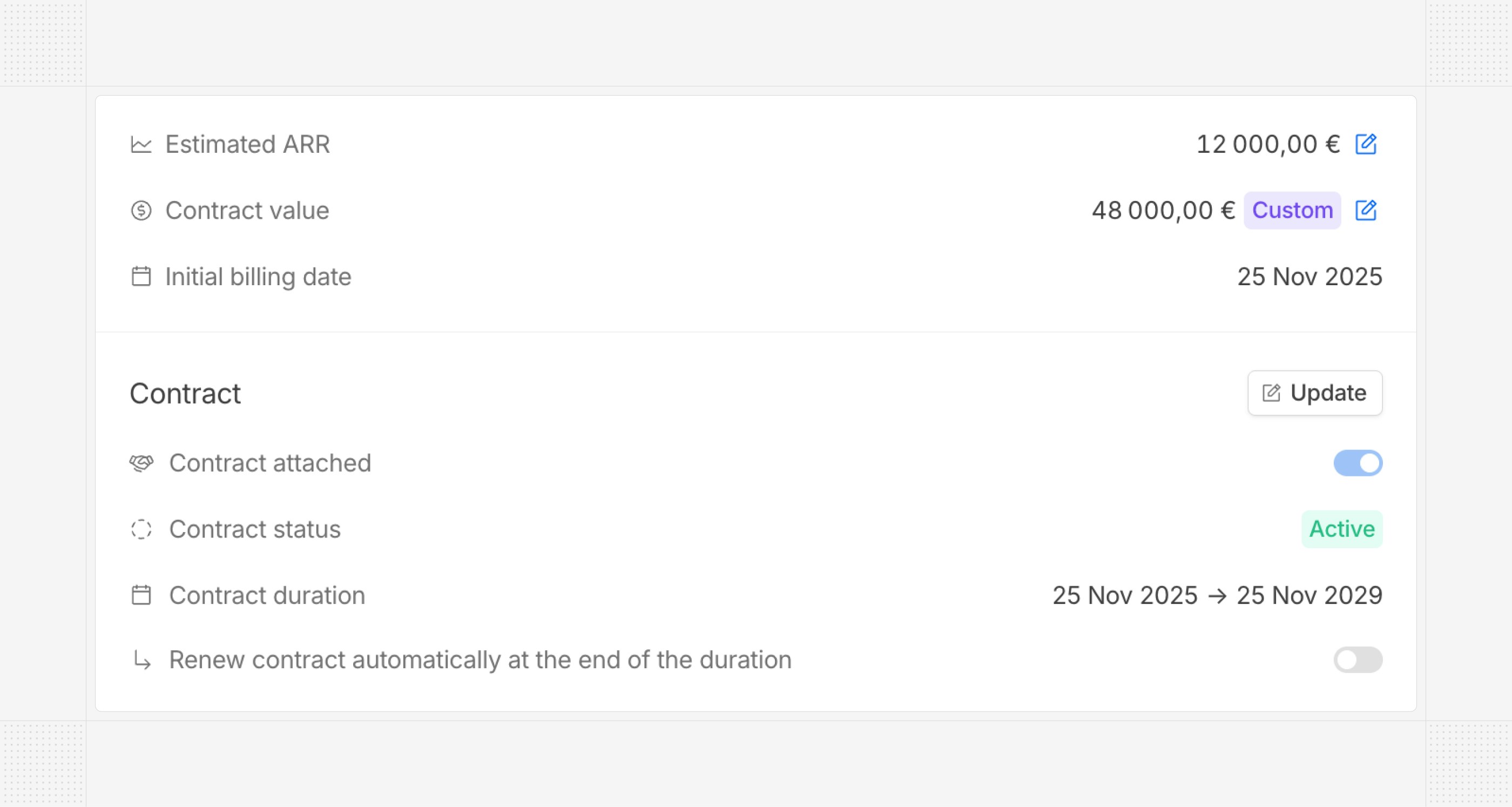 Hyperline provides automatic calculation of Annual Recurring Revenue (ARR) and contract value for subscriptions out of the box, based on their pricing and billing cycles. However, there are scenarios where you may want to override these automatic calculations. Hyperline now allows you to set custom values for both ARR and contract value on a per-subscription basis, in addition to displaying them in the subscription overview.