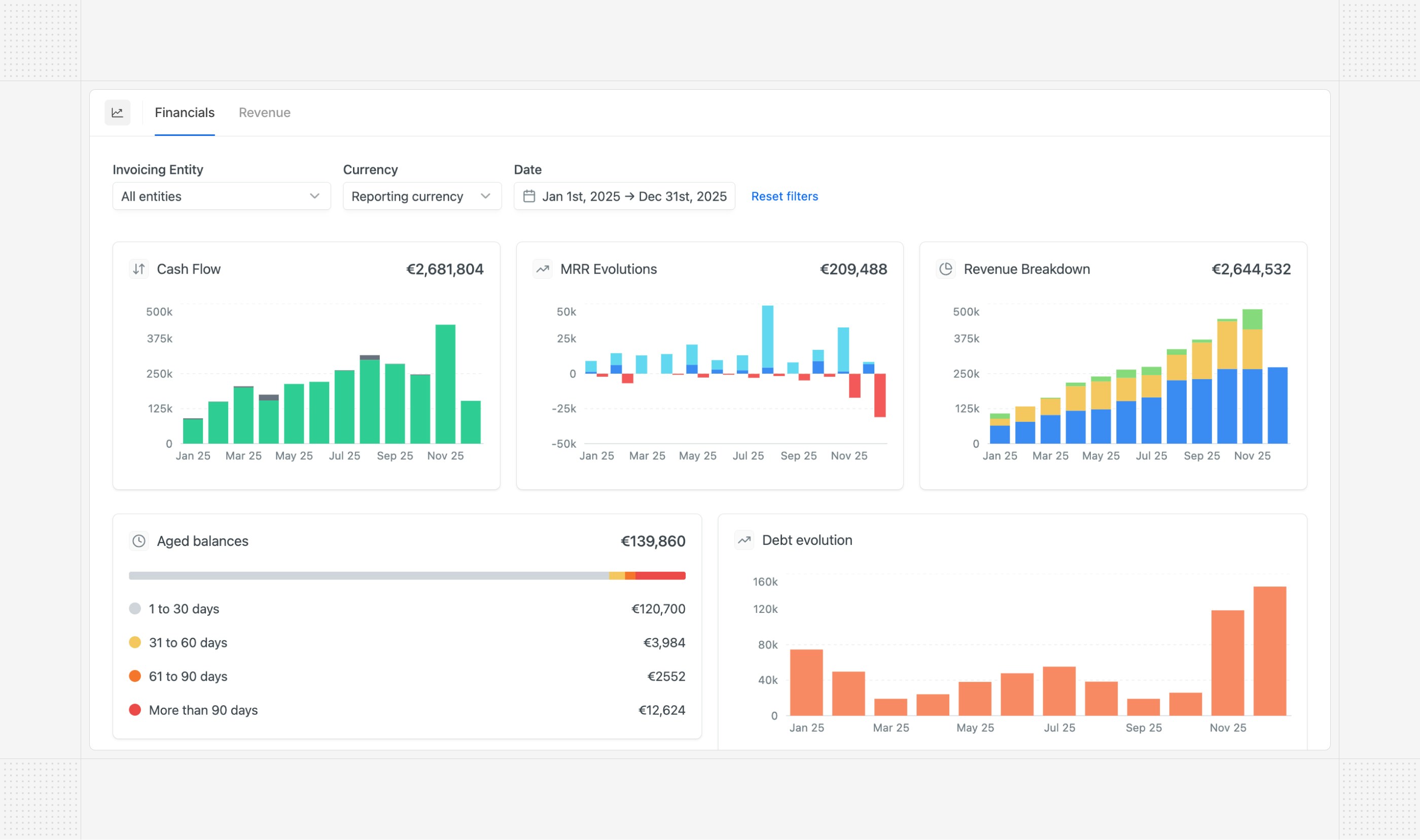 Hyperline now offers a full Insights module that provides a comprehensive overview of your financial and revenue metrics. The Financial page includes cash-flow visibility, MRR and debt evolution, aged balances, and complete breakdowns of your revenue and accounts receivable, as well as detailed MRR analytics including new, expansion, contraction, lost, and net changes.