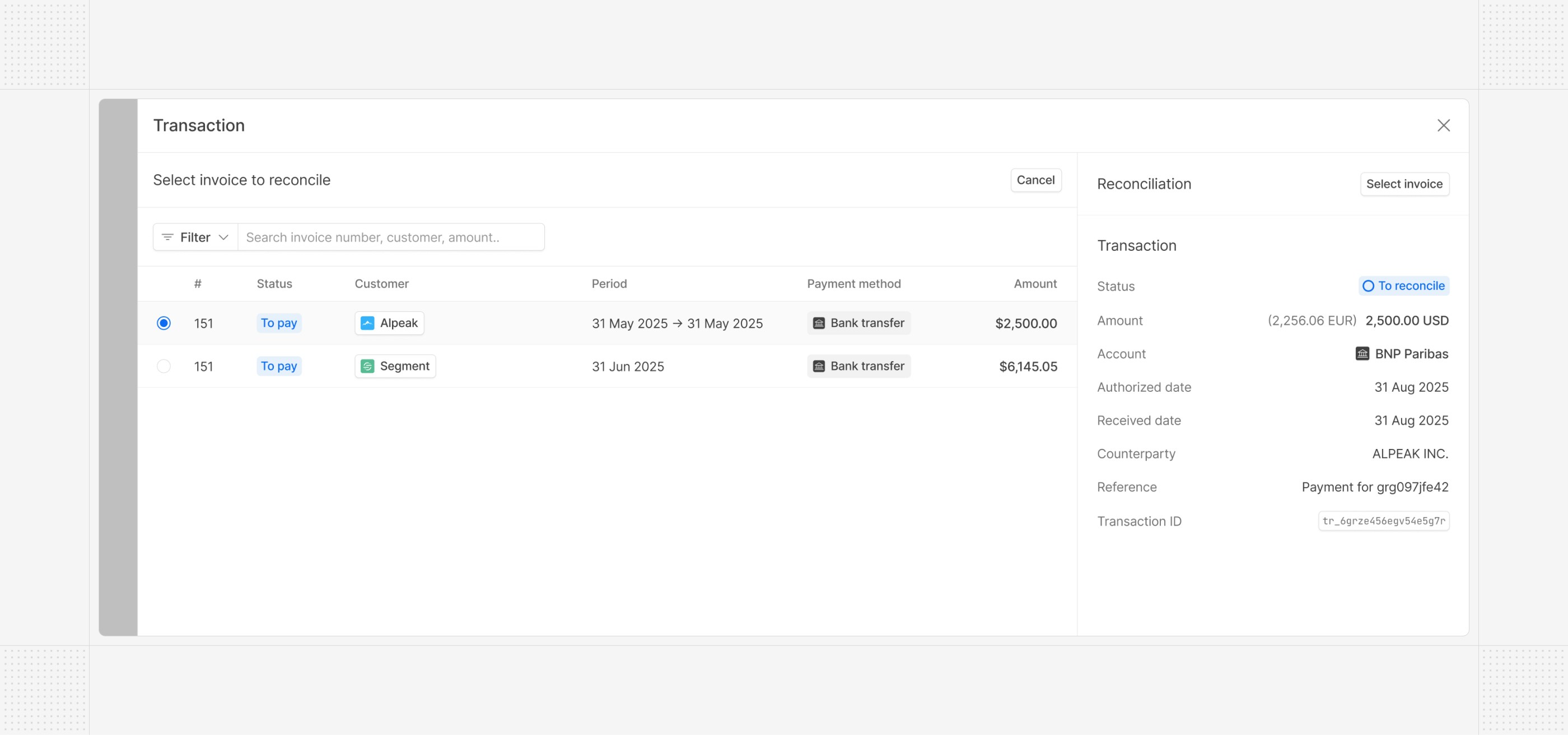 Automated invoice reconciliation from bank accounts has long been available in Hyperline, including the ability to validate matches from each invoice. Hyperline now also supports reconciliation from bank statements.