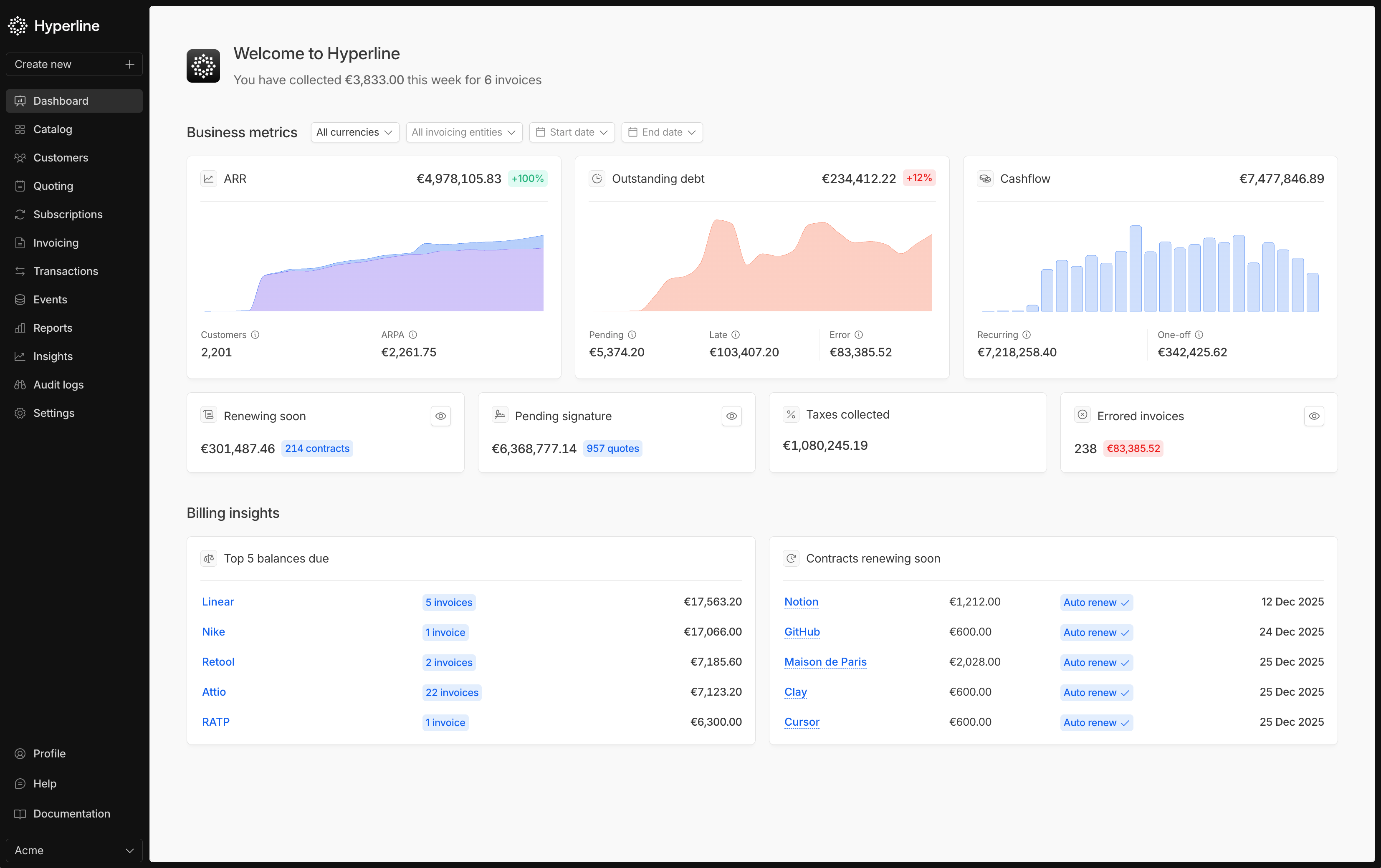 Annual Recurring Revenue (ARR) represents the total annualized revenue a SaaS company expects to generate from active subscriptions over a year. It provides a long-term view of predictable revenue and helps track revenue growth trends.How ARR is calculated in Hyperline 💡