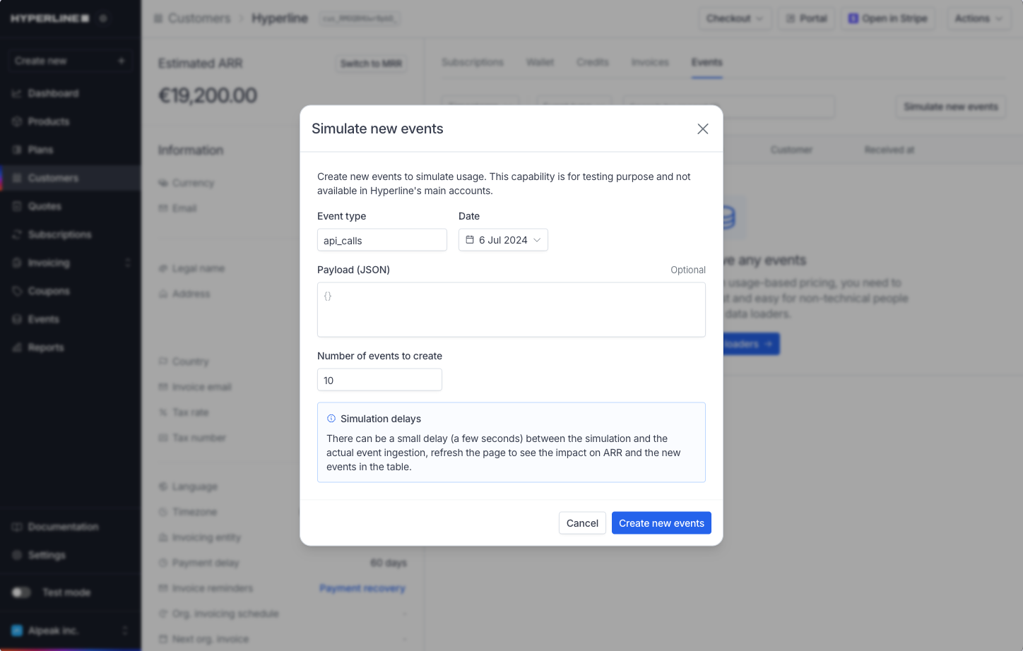 This applies if you want to configure your first usage-based plan and to assign a subscription to a customer in order to test Hyperline. In the test account, you can simulate usage data by generating fake events for a specific customer. This is done in two steps:1