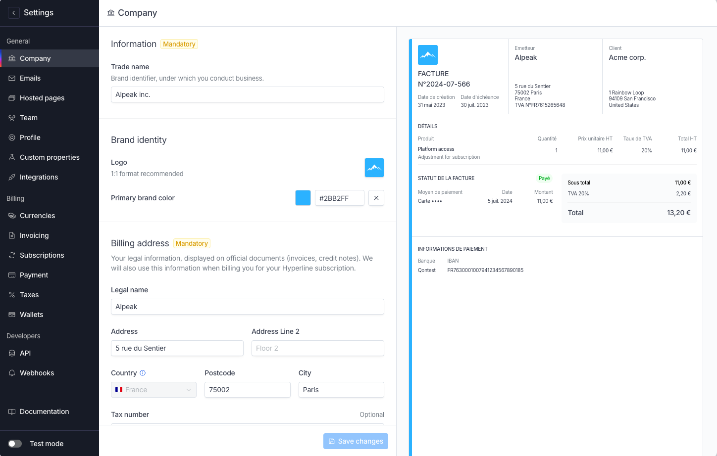 Personnalise the billing experience for your customers by adding your brand assets.- Add the logo you want to display on public pages, emails and documents (invoices, credit notes, quotes).