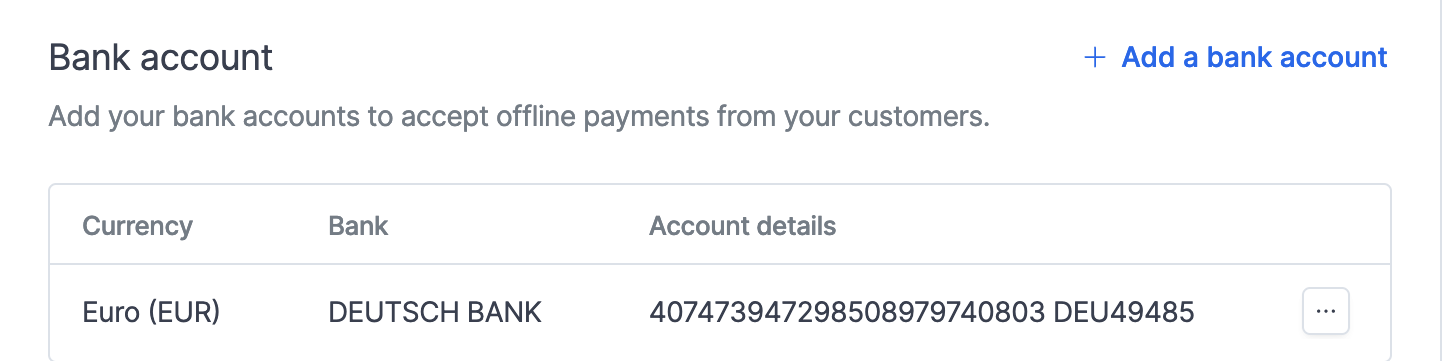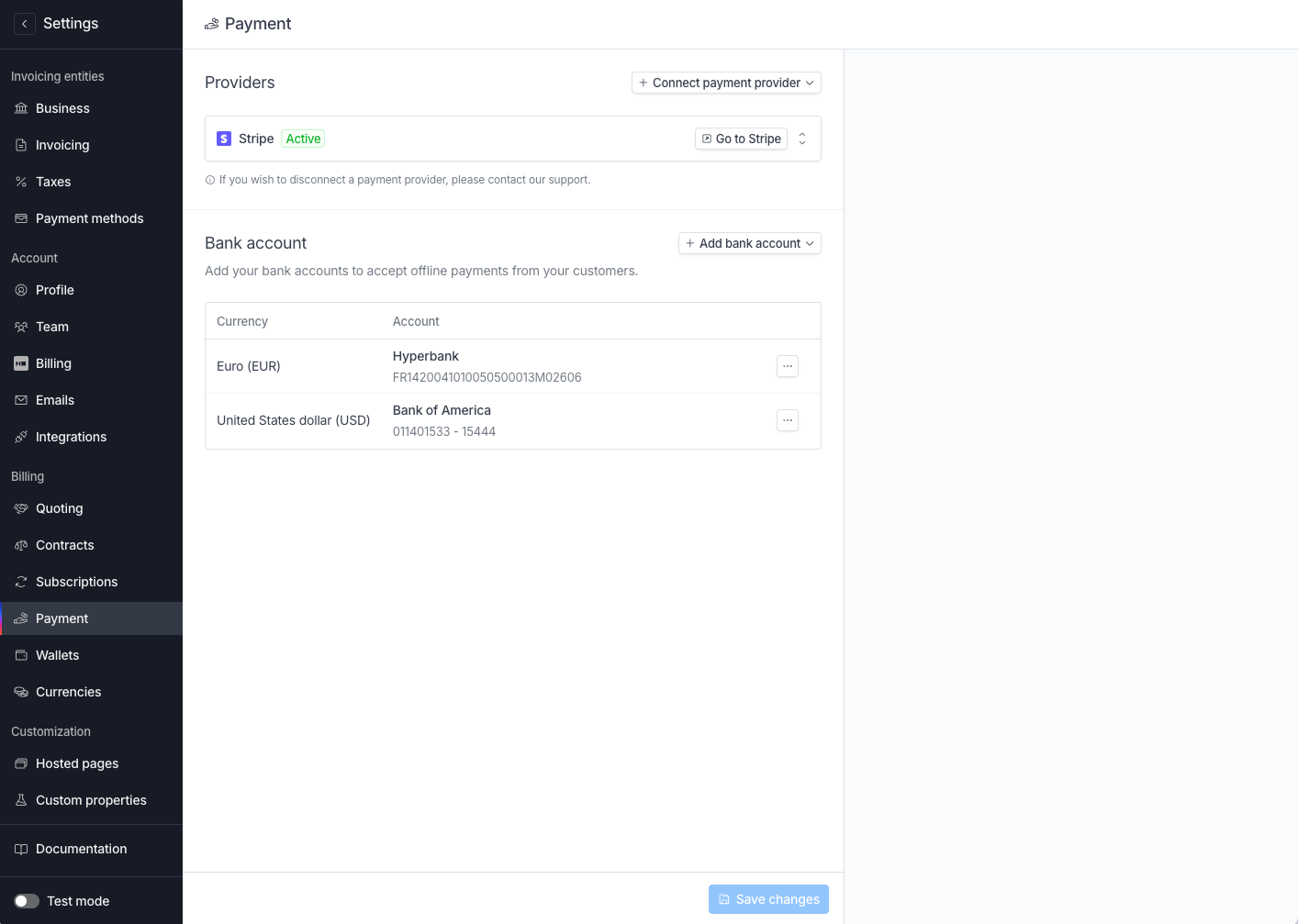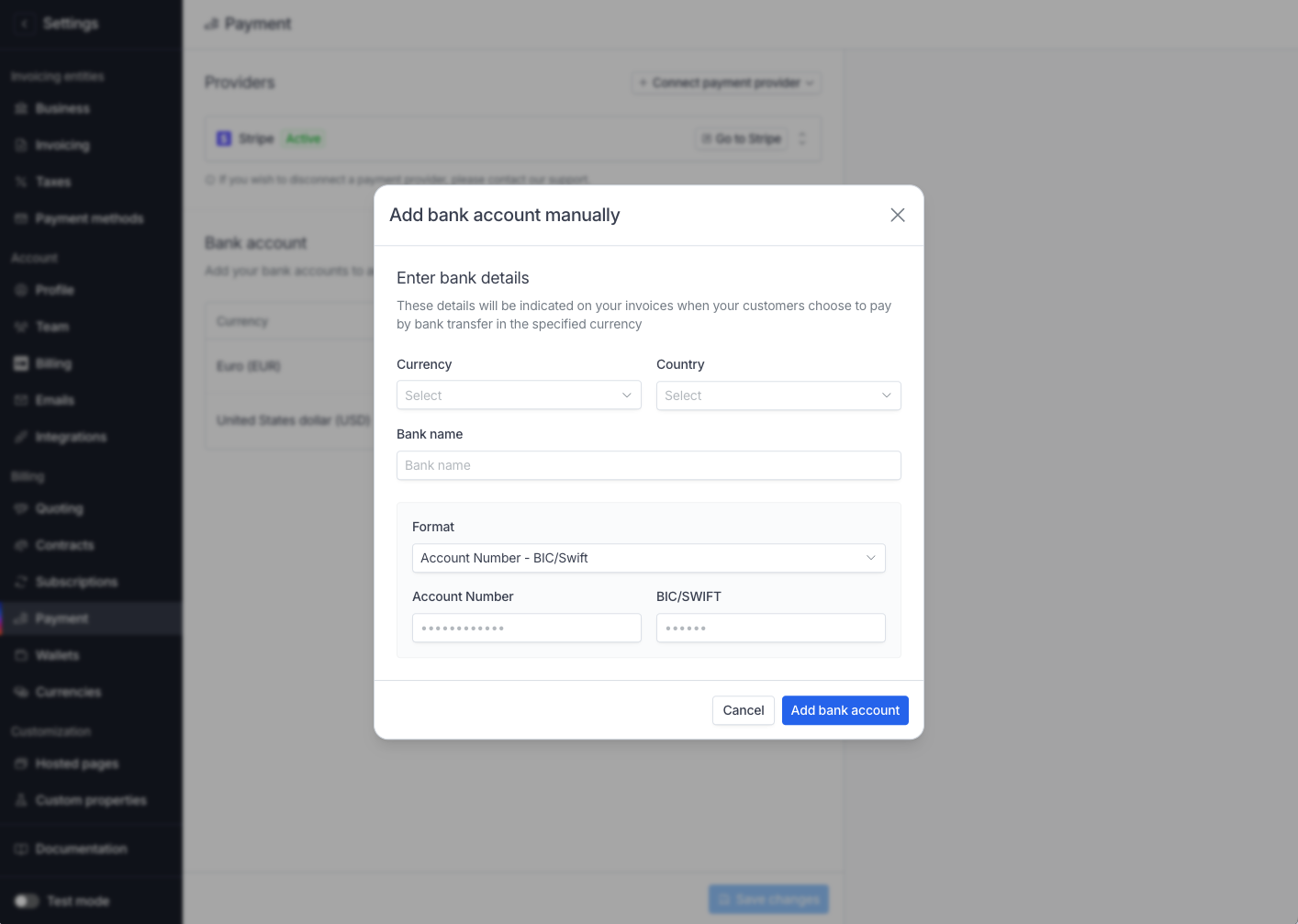 If you intend to accept bank transfers from your customers, you can add one (or several) bank accounts by clicking on Add bank account. It is the account that will be displayed on your invoices depending on the currency of the customer receiving invoice when your customers have bank transfer as their active payment method.