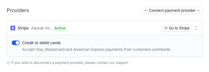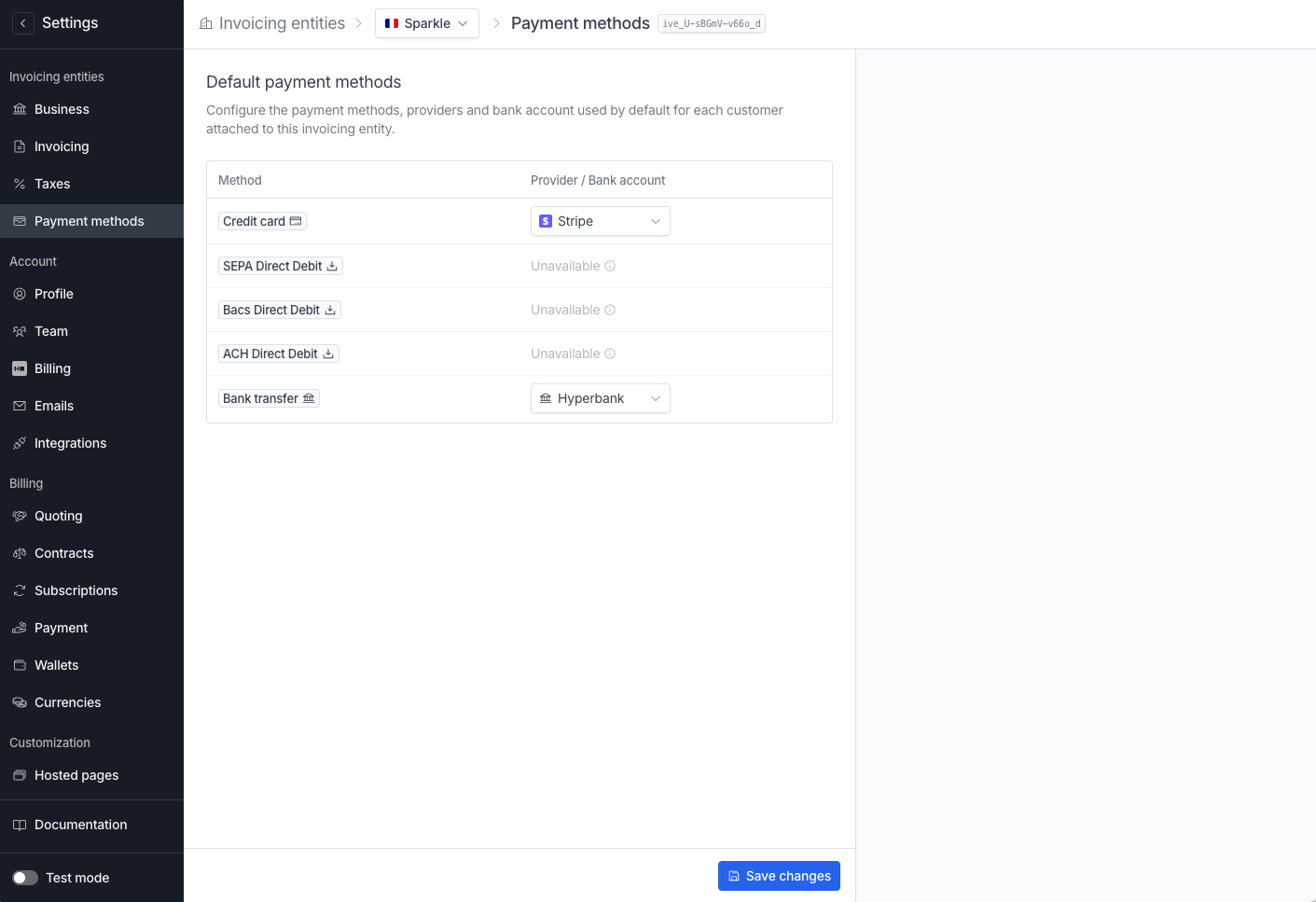 Now that everything is configured, head over to the Payment methods page in the invoicing entities section. You can choose which payment methods you want to accept from your customers from the following:- Debit or credit cards payments