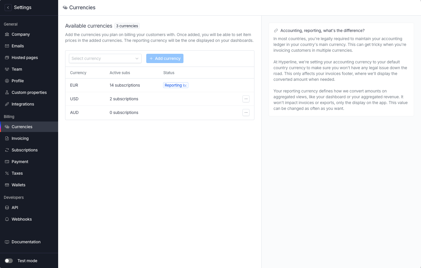 In most countries, you’re legally required to maintain your accounting ledger in your country’s main currency. This can get tricky when you’re invoicing customers in multiple currencies. At Hyperline, we’re setting your accounting currency to your invoicing entity country currency to make sure you won’t have any legal issue down the road.This only affects your invoices’ footer, where we’ll display the converted amount when needed.