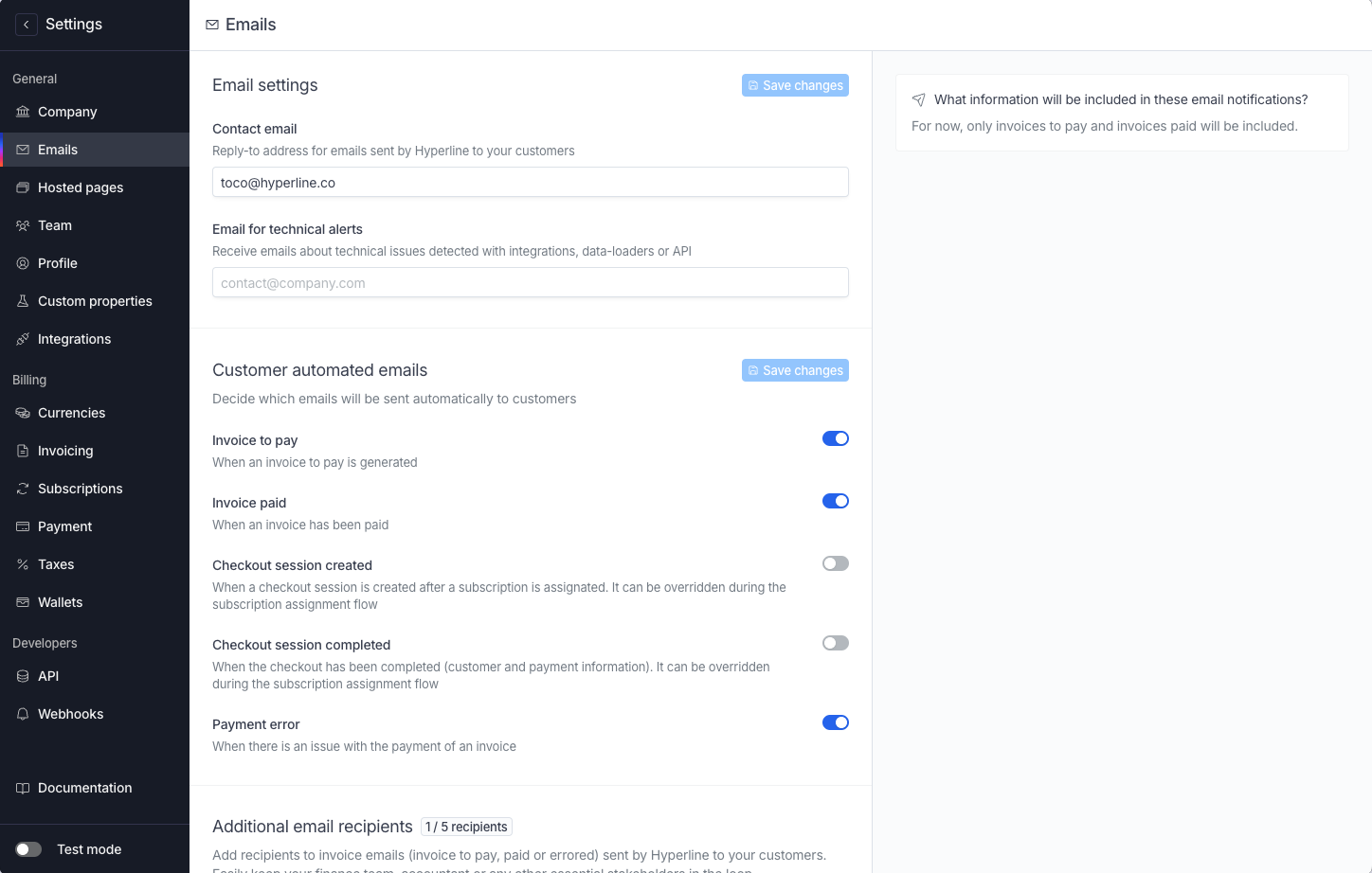 Hyperline provides the ability to add 5 recipients to the emails it sends to your customers. This feature allows you to keep key stakeholders, such as your finance team or accountant, informed. The email notifications currently include information about pending invoices and paid invoices. This ensures that your team is always up-to-date with your billing status.