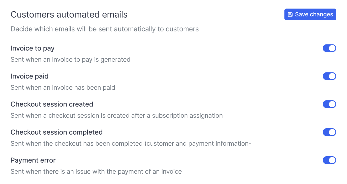 Hyperline allows you to manage the types of emails sent to your customers. There are 5 different types of emails that can be enabled or disabled according to your preferences.- Invoice to pay