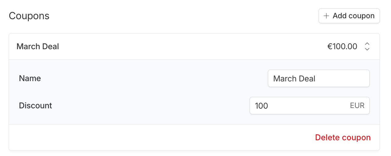 You can add a coupon and customise its name and discount amount.Delete coupon