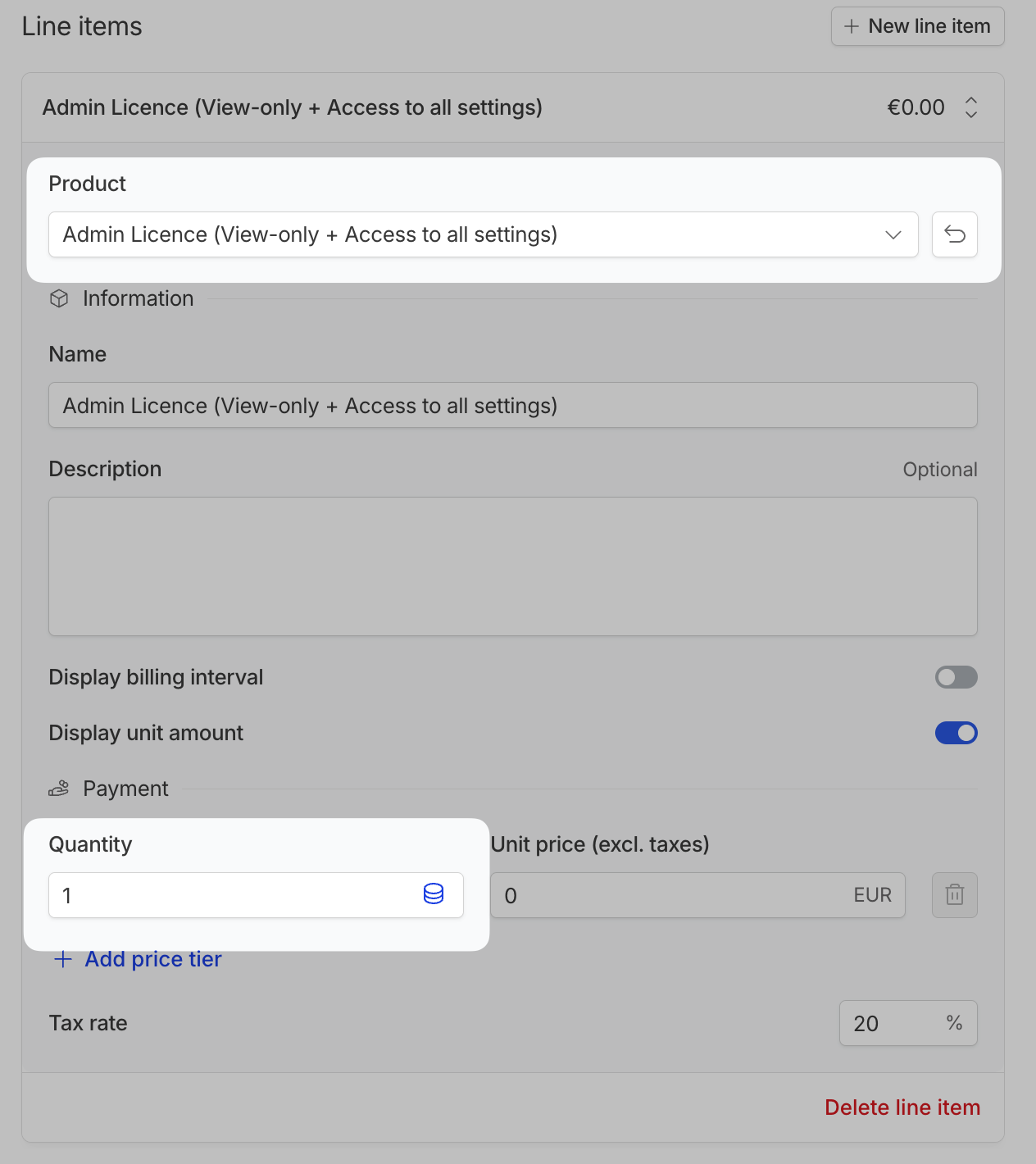 You can add an unlimited amount of line items to your invoice by clicking on new line item. The name, description periods, and tax rate can be fully customized. The quantity and unit price will be multiplied automatically to calculate the total price. You can use an existing product from your catalog, and the up-to-date usage for the invoice period can be retrieved by clicking on the “database” icon on the quantity field (only for usage-based products). The price is not computed automatically.