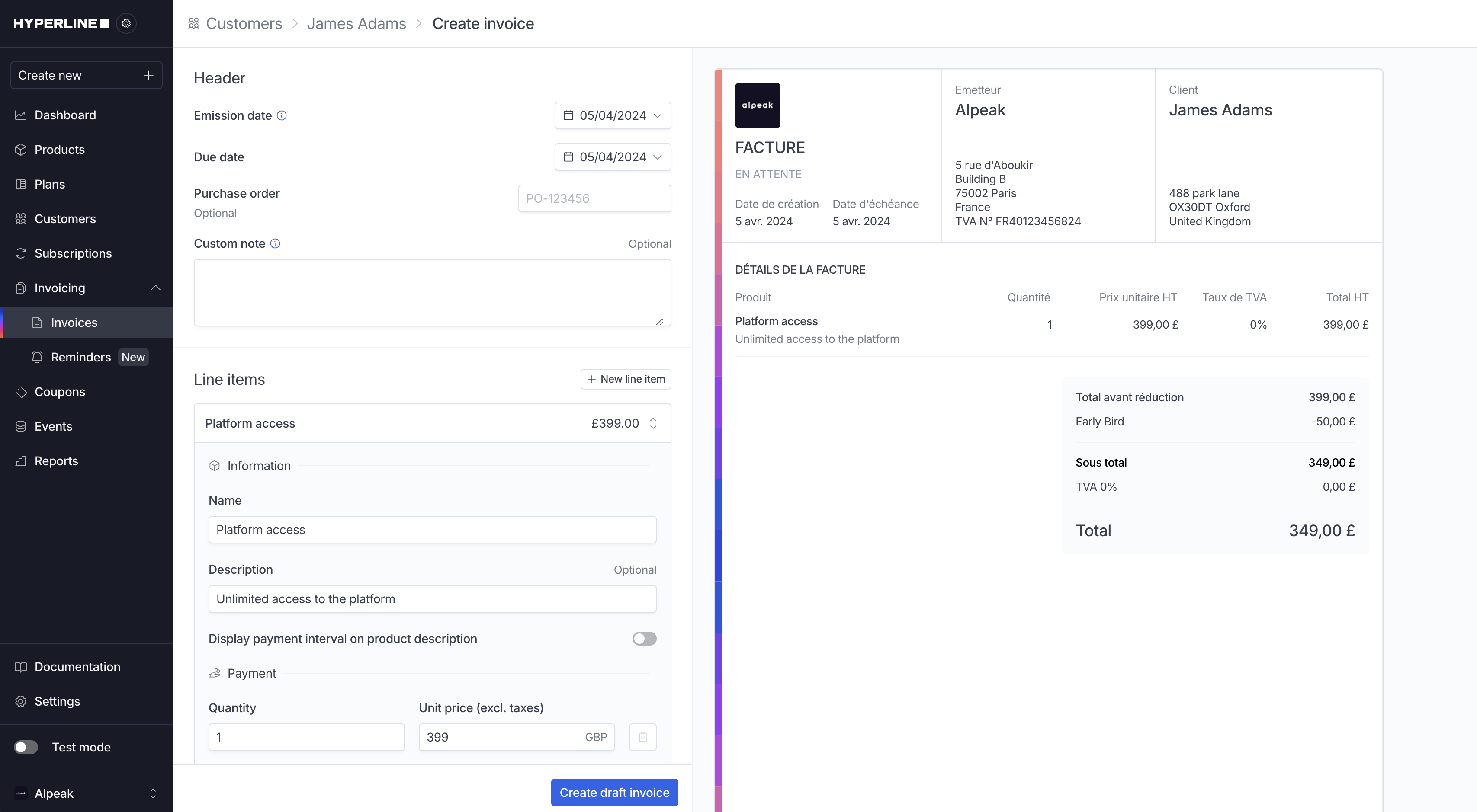 Once all set, you can click on ‘Create draft invoice’. The invoice generated will not be sent to the customer, but put into adraft
