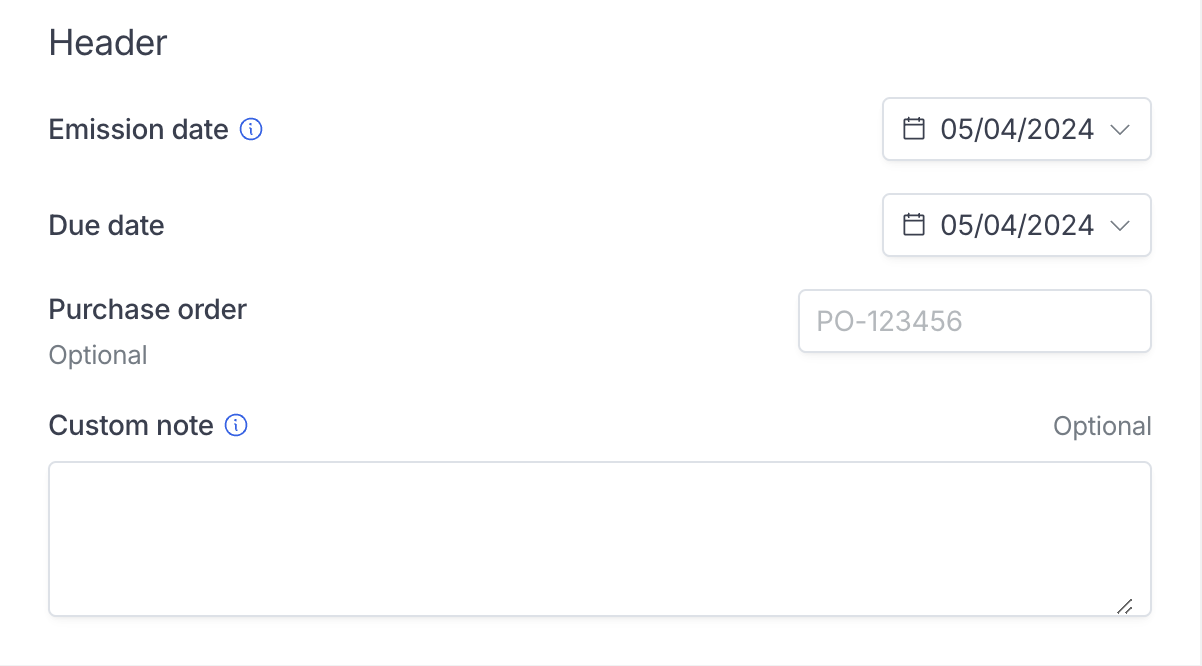 Optionally, you can add a custom purchase order on the invoice.Custom note