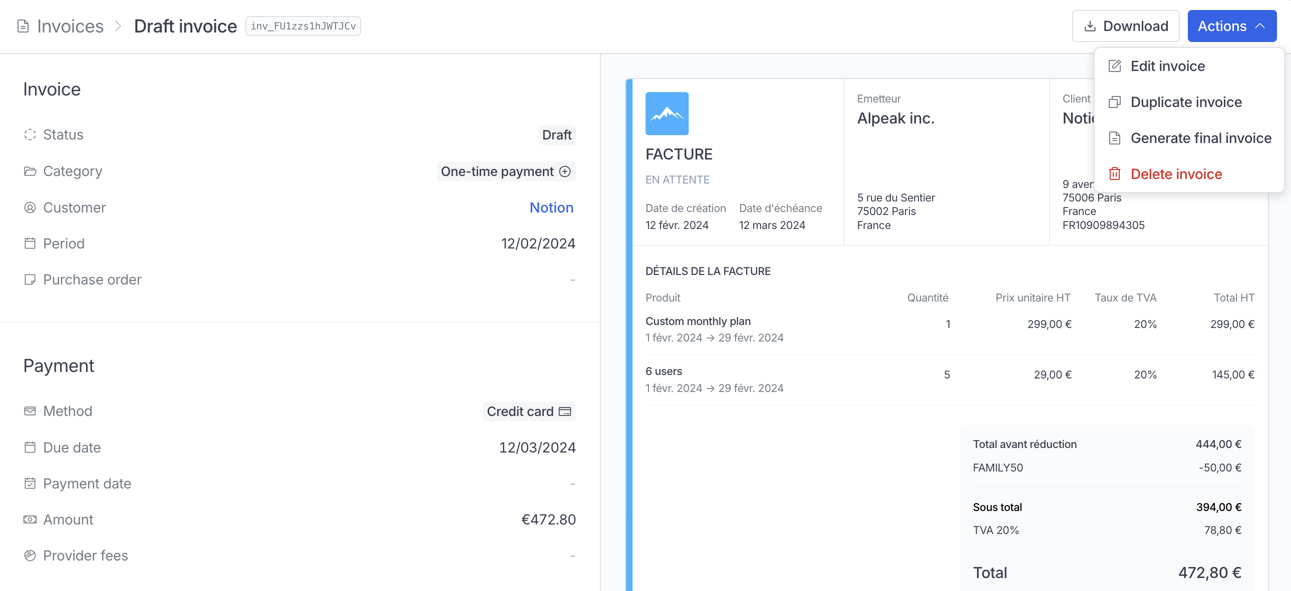 From an existing invoice, click on the ‘Edit invoice’ button in the Actions dropdown.