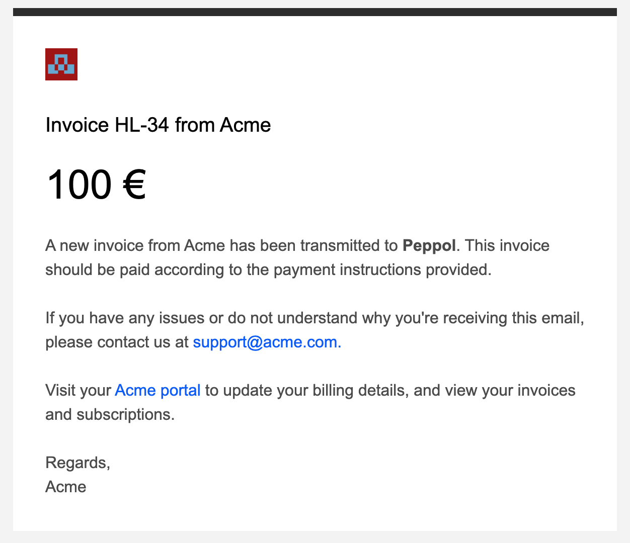 When e-invoicing is enabled and the invoice is eligible for automatic transmission, the “Invoice to pay” email notification is not sent when the invoice is issued, but only when the invoice is actually transmitted to the e-invoicing system. This email indicates to the customer that the invoice has been transmitted and is ready to be paid.