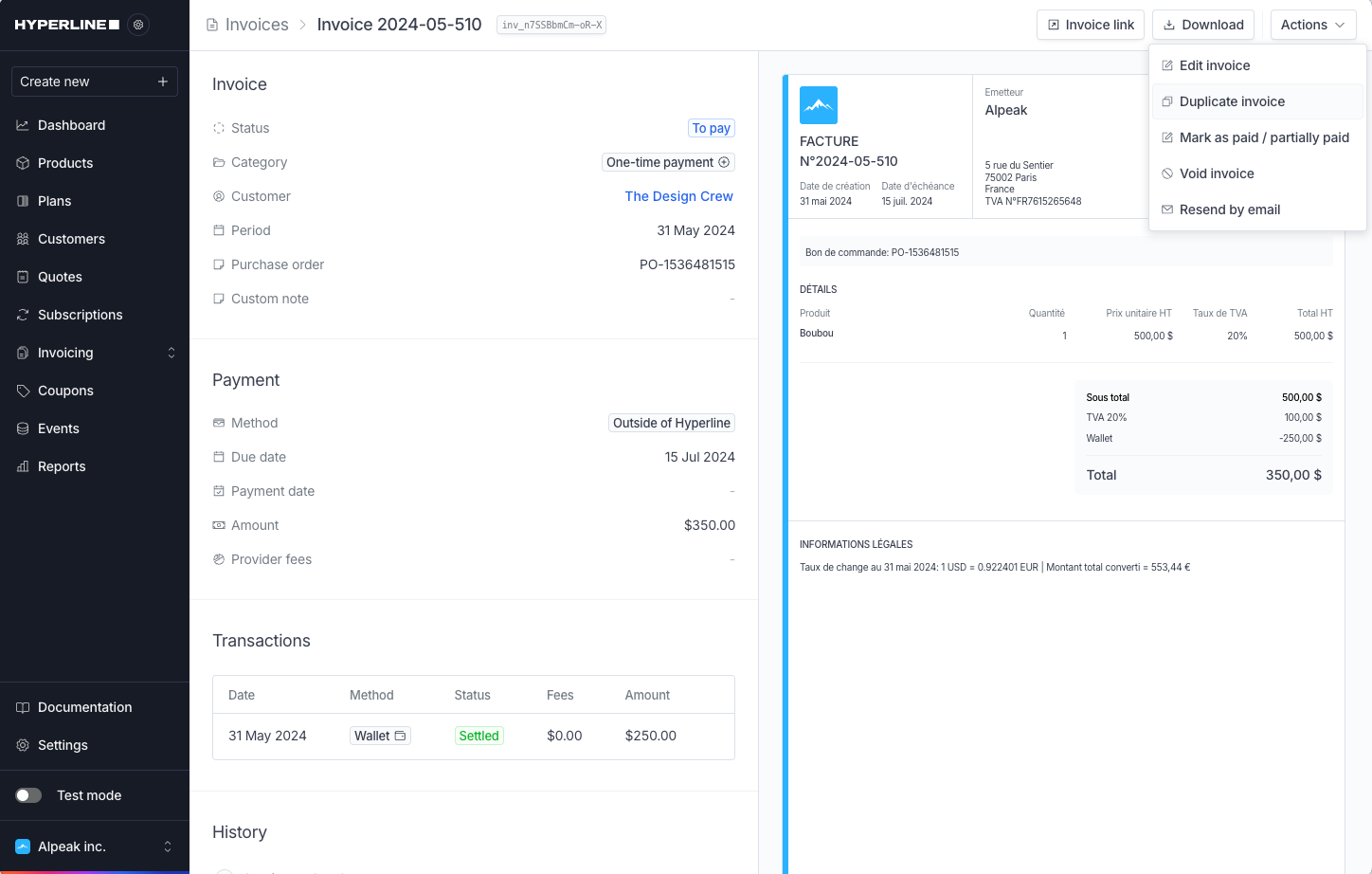 Click Create draft invoice to generate the invoice withdraft status. Draft invoices are not sent to customers and can be edited multiple times before finalization.