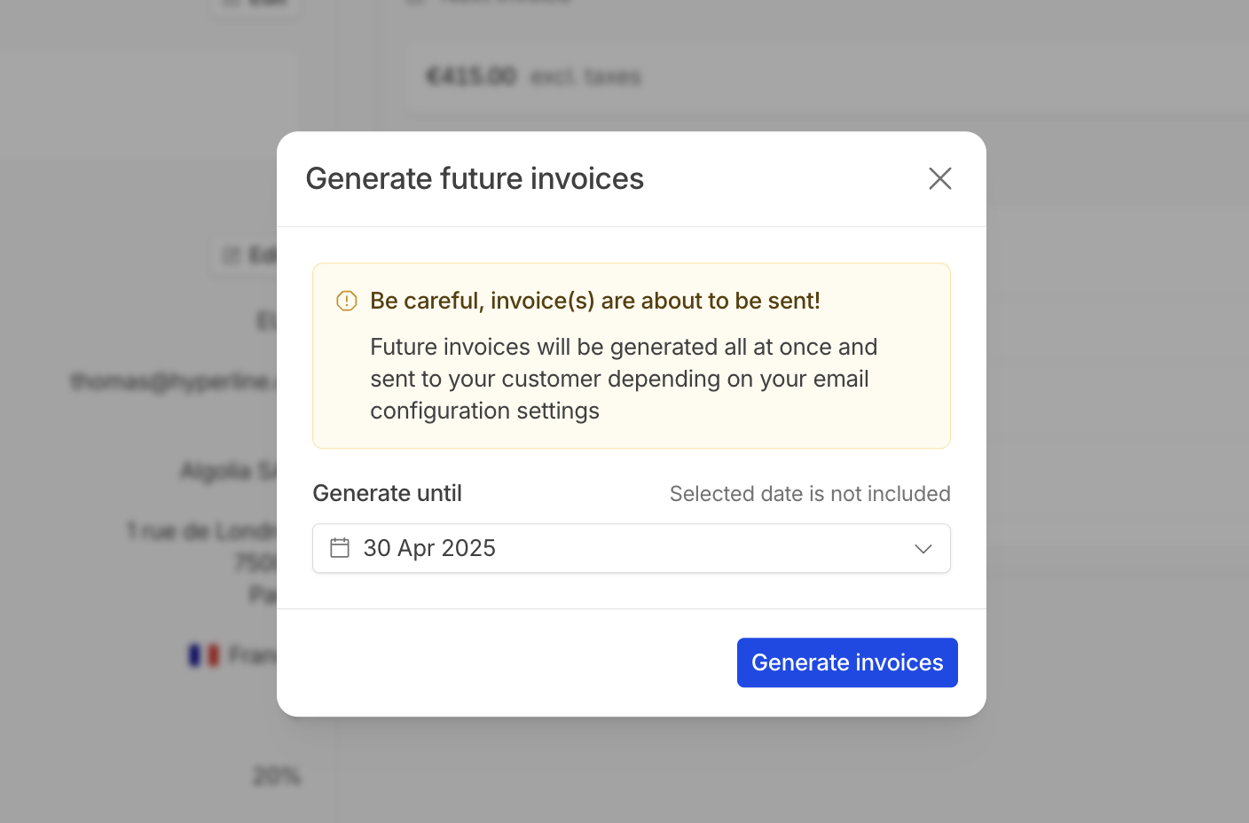 Hyperline allows you to generate subscription invoices in advance. To do so, go to Subscription > Generate future invoices, then select the date up to which you want invoices to be issued. The subscription will be advanced to that date, and all corresponding invoices will be generated and sent immediately. Depending on the payment method:- Invoices will be charged automatically (credit card, direct debit)