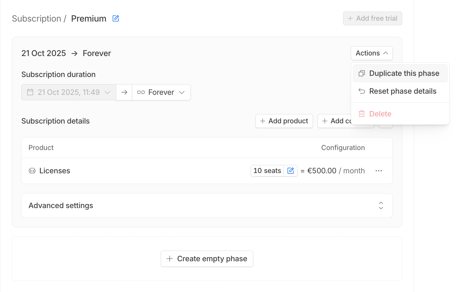 When changing current phase configuration, all updates will take effect starting on the next invoice generated. Products and coupons can be freely updated, added or removed.Example 💡