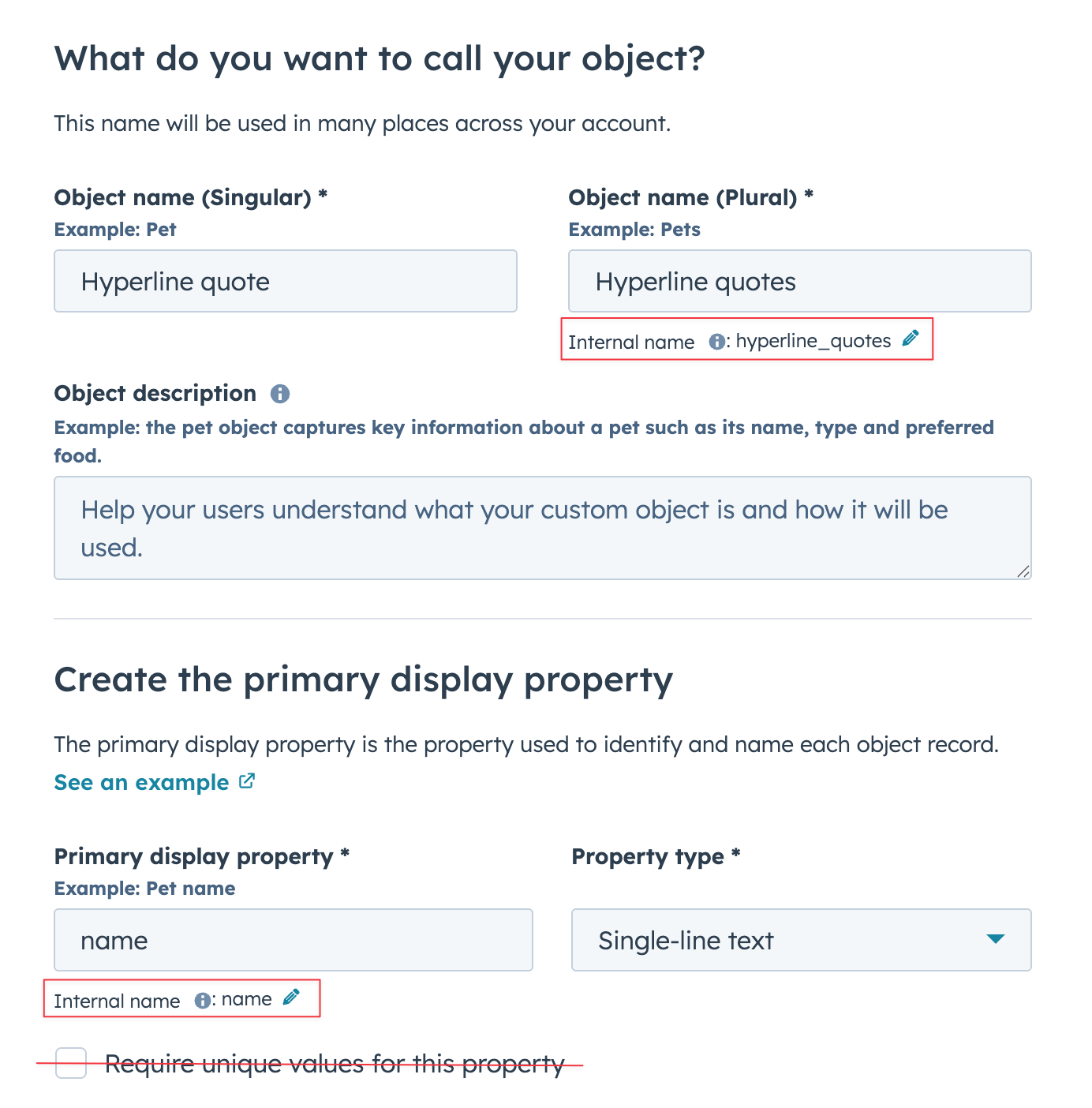 - Enter the object details. Hyperline requires the Internal name to match one of the names listed in the table above. You may customize the display name as you prefer.